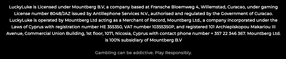 LuckyLuke casino is a young gambling establishment of 2021, developed with a western theme. It is operated by Mountberg Limited, a subsidiary of Mountberg B.V. The latter has been licensed by the government of Curacao, allowing it to offer online pokies to Australian players legally. License approval number: 8048/JAZ.
